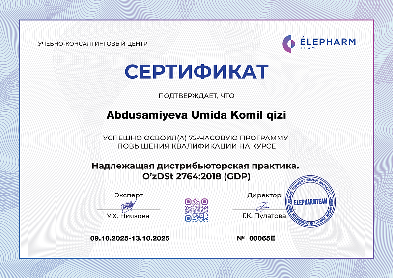 Сертификат о прохождении курса повышения квалификации «Надлежащая дистрибьюторская практика GDP»