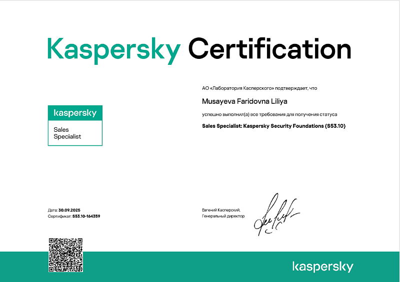 Сертификат специалиста по продажам бизнес-решений "Лаборатории Касперского" - Kaspersky Security Foundations